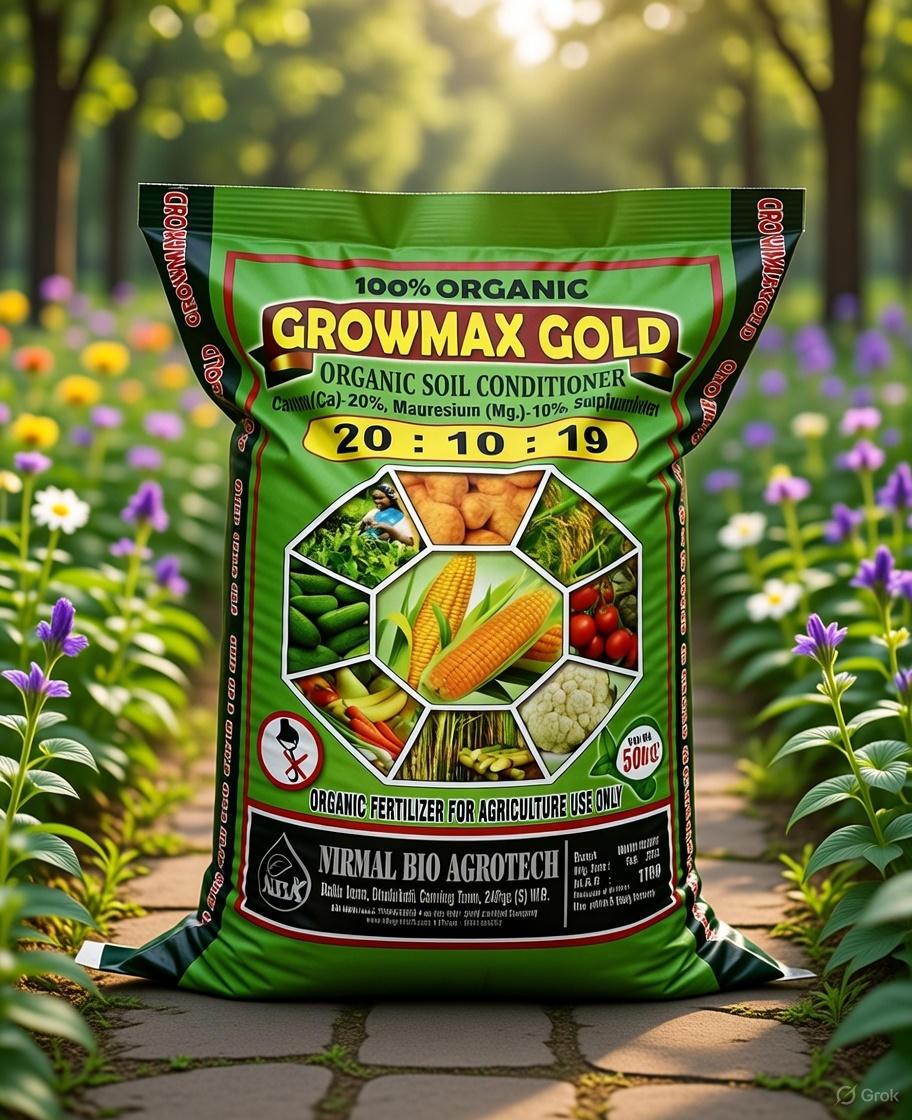 Gromax Gold Bio-NPK 20:10:10 by Nirmal Bio Agrotech is an organic compost fertilizer enriched with NPK, calcium, magnesium, sulphur, bio-nitrogen, and phosphorus. It improves soil fertility, supplies balanced nutrients, and enhances the growth and yield of vegetables, fruits, paddy, tea, and flower crops. Apply 15–20 kg per acre. Available in a 50 kg packet.